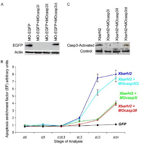 Fig. S3. MO against Casp3 protect Xenopus embryos from barhl2-induced apoptosis. Two MOs, MOcasp3I and MOcasp3II, were designed to inhibit endog- enous Casp3 activity together with a control MO, MOcasp3ct. We used three different means to evaluate the capacity of the Casp3 MO to specifically block endogenous Casp3 activity. (A) MOcasp3I and MOcasp3II bind their complementary sequences and inhibit translation in embryos. The 5â² end of the casp3 gene containing the MOcasp3I and MOcasp3II sequences was subcloned in-frame upstream of the EGFP cDNA. The 5â²-gtttggatcagatcgggttttggtagccaagATGgaa- gaatcccagaatggt-3â² sequence was subcloned in the ClaI site of the vector pCS2-EGFP to generate the MO-EGFP expression vector. Western blotting analysis showed that translation of this construct containing the 5â² end of the casp3 gene fused upstream of the EGFP gene was completely inhibited by coinjection with each specific MO, whereas coinjection with the control MO had no effect. (A) Western blot analysis against EGFP with 3-μg protein extracts from Xenopus st 13 embryos. Translation of the MO-EGFP fusion protein (lane 1) is inhibited by coinjection with MOcasp3I (lane 2) or MOcasp3II (lane 3), whereas MOcasp3ct has no effect (lane 4). α-actin (42 kDa) was used as a loading control. (B and C) MOcasp3I and MOcasp3II protect Xenopus embryos from apoptosis induced by Xbarhl2 overexpression. The protective effect of MOcasp3I and MOcasp3II against Barhl2-induced apoptosis was shown by ELISA to detect cytoplasmic histone- associated mono- and oligo-nucleosomes, which are specifically released during apoptosis (B) or by Western blotting (C). (B) Kinetics of Barhl2-induced ap- optosis between st 8 and st 14 in the presence or absence of MOcasp3. Embryos were injected in one dorsal blastomere at the two-cell stage with EGFP, barhl2 cRNA together with EGFP, barhl2 cRNA together with MOcasp3I, MOcasp3II, or MOcasp3ct and collected at the indicated developmental stages. Cell death was measured by an ELISA for cytoplasmic histone-associated mono- and oligo-nucleosomes that are specifically released during apoptosis. The apoptosis en- richment factor (EF) was calculated using GFP-injected embryos as a control. From st 10.5 on, a steady increase in the apoptosis EF can be observed in barhl2- injected embryos (EF = 8 at st 14). Coinjection of barhl2 cRNA with MOcasp3I or MOcasp3II induces a significant delay in the onset of apoptosis (EF = 4 at st 14), whereas embryos injected with barhl2 cRNA together with MOcasp3ct behave like embryos injected with barhl2 cRNA alone (EF = 7.8 at st 14). (C) Western blot analysis of 15 μg protein extracted from the same batches of embryos at st 13: lane 1, barhl2 (50 pg) and EGFP (50 pg); lane 2, barhl2 (50 pg) and MOcasp3I; lane 3, barhl2 (50 pg) and MOcasp3II; lane 4, barhl2 (50 pg) and MOcasp3ct. A nonspecific band was used as a loading control. |