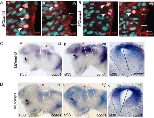 Fig. S5. Barhl2 or Casp3 depletion phenotypic defects. (A and B) Disorganization of the neuroepithelium. Representative IHC for β-catenin (red; membrane staining) together with P-3H (red; nuclear staining) merged with BB (cyan) images on diencephalic sections of st 26/27 Xenopus embryos injected with MO- barhl2 (A) or MOcasp3 (B). The (Aa) control and (Ab) injected sides of representative sections are shown. Inj, injected side. Arrows indicate part of the apical surface where β-catenin staining is abnormal; arrow end indicates mitotic nuclei. (C and D) Increase in Wnt signaling in the prosomere P2 alar plate ccnd1 expression profiles at st 33 or 30 analyzed by ISH. The ct (Ca) and injected (Cb) sides of one representative dissected neural tube flat-mounted and (Cc) a section at the diencephalic level are shown. The percent of embryos exhibiting the phenotype is indicated. (Ca) ct and (Cb and Cc) Barhl2-depleted (89%, n = 19); (Da) ct and (Db and Dc) Casp3-depleted neural tubes (82%, n = 39). The white rectangle delineates the prosomere P2 alar plate. The black arrow indicates lo- calization of the optic stalk. |