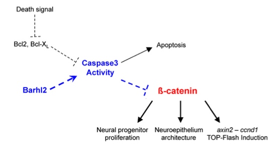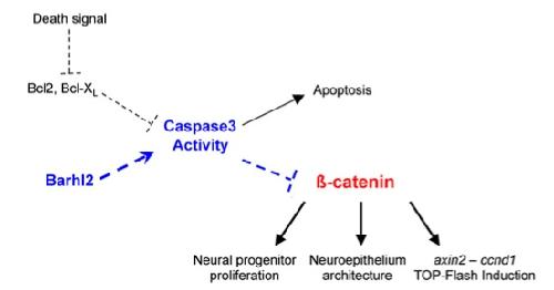 Fig. S7. A model for the genetic pathway for the regulation of β-catenin activity by Barhl2 and Casp3 |