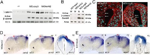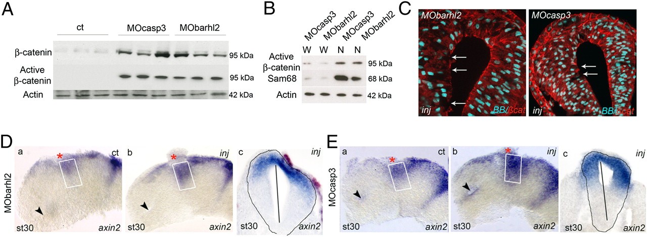 Fig. 2. Barhl2 and Casp3 depletion increases β-catenin and Wnt activity. (A and B) Western blot analysis. Proteins (10 μg) extracted from st 26 heads of embryos injected with GFP (ct), MOcasp3, or MObarhl2. α-actin (42 kDa) is used as a loading ct. (A) Barhl2- and Casp3-depleted head extracts exhibit a significant increase in both β-catenin and active β-catenin levels (95 kDa) as indicated. (B) Active β-catenin detected in MOcasp3- or MObarhl2-injected head extracts is enriched in nuclear head extracts (N) compared with that in whole-cell head extracts (W). Sam68 is used as a marker of proper nuclear proteins extraction. (C) β-catenin mislocalization. Representative IHC images for β-catenin (red) merged with BB (blue) on diencephalic sections of st 26/27 embryos injected with MObarhl2 or MOcasp3. Arrows indicate the part of apical surfaces where β-catenin staining is disrupted. Inj, injected side. (D and E) Analysis of Wnt activity. axin2 expression profiles at st 30 analyzed by ISH. The ct (a) and injected (b) sides of one representative dissected neural tube flat-mounted or (c) a section at the diencephalic level are shown. The percent of embryos exhibiting the phenotype is indicated. (Da) ct and (Db and Dc) Barhl2-depleted (80%, n = 15) and (Ea) ct and (Eb and Ec) Casp3-depleted neural tubes (78%, n = 18). The white rectangle delineates the prosomere P2 alar plate. The black arrow indicates localization of the optic stalk. |