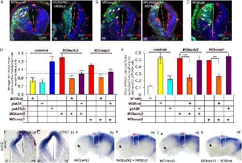 Fig. 3. Barhl2- and Casp3-depleted defects are rescued by inhibition of β-catenin activity. (AâC) Representative IHC. P-3H (red) merged with BB (blue) and GFP (green) images on diencephalic sections of st 26/27 embryos injected with (A) MObarhl2 or MObarhl2/MOÃcat, (B) MOcasp3 or MOcasp3/MOÃcat, or (C) MOÃcat. Inj, injected side. The white arrows indicate GFP+/P-3H+ cells detached from the apical membrane. (D) Normalization of Rinj/ct. The dotted line indicates a Rinj/ct of 1. MOÃcat (n = 10); gsk3β (n = 8); gsk3β-dn (n = 4). MObarhl2 (n = 5), MObarhl2/MOÃcat (n = 13), MObarhl2/gsk3β (n = 8); MOcasp3 (n = 8), MOcasp3/MOÃcat (n = 8); MOcasp3/gsk3β (n = 4); ct vs. MOÃcat (P ⤠0.001); ct vs. gsk3β (P ⤠0.025); ct vs. gsk3β-dn (P ⤠0.005); MObarhl2 vs. MObarhl2/MOÃcat (P ⤠0.001); MObarhl2 vs. MObarhl2/gsk3β (P ⤠0.011); MOcasp3 vs. MOcasp3/MOÃcat-10 (P ⤠0.000); MOcasp3 vs. MOcasp3/gsk3β (P ⤠0.002). (E) Normalization of the ratio of ectopic mitosis. NI, noninjected. MOÃcat (n = 5); gsk3β (n = 6); MObarhl2 (n = 8), MObarhl2/MOÃcat (n = 10), MObarhl2/gsk3β (n = 4), MOcasp3 (n = 7) MOcasp3/MOÃcat (n = 7), MOcasp3/gsk3β (n = 5); ct vs. MOÃcat (P ⤠0.005); ct vs. gsk3β (P ⤠0.007); MObarhl2 vs. MObarhl2/MOÃcat (P ⤠0.003); MObarhl2 vs. MObarhl2/gsk3β (P ⤠0.665); MOcasp3 vs. MOcasp3/MOÃcat (P ⤠0.007); MOcasp3 vs. MOcasp3/gsk3β (P ⤠0.604); MOÃcat vs. MObarhl2/MOÃcat (P ⤠0.01); MOÃcat vs. MOcasp3/MOÃcat (P ⤠0.015). (FâI) Normalization of Wnt activity. axin2 expression profile of st 30-injected neural tubes analyzed by ISH. (F and G) Representative embryos are shown either as the diencephalic section or (H and I) the ct (a) and injected (b) sides of one representative dissected neural tube mounted flat. At st 30 in the P2 alar plate, axin2 expression territory is reduced in MOÃcat-depleted (F; 73%, n = 15) and gsk3β overexpressing (G; 75%, n = 12) embryos. The P2 alar plate (white rectangle) axin2 expression territory is reduced in both MObarhl2/MOÃcat- (compare H a and b; 66%, n = 18) and MOcasp3/MOÃcat-injected (compare I a and b; 65%, n = 38) sides compared with the MObarhl2- and MOcasp3-injected and respective ct sides. The black arrow indicates the optic stalk. |