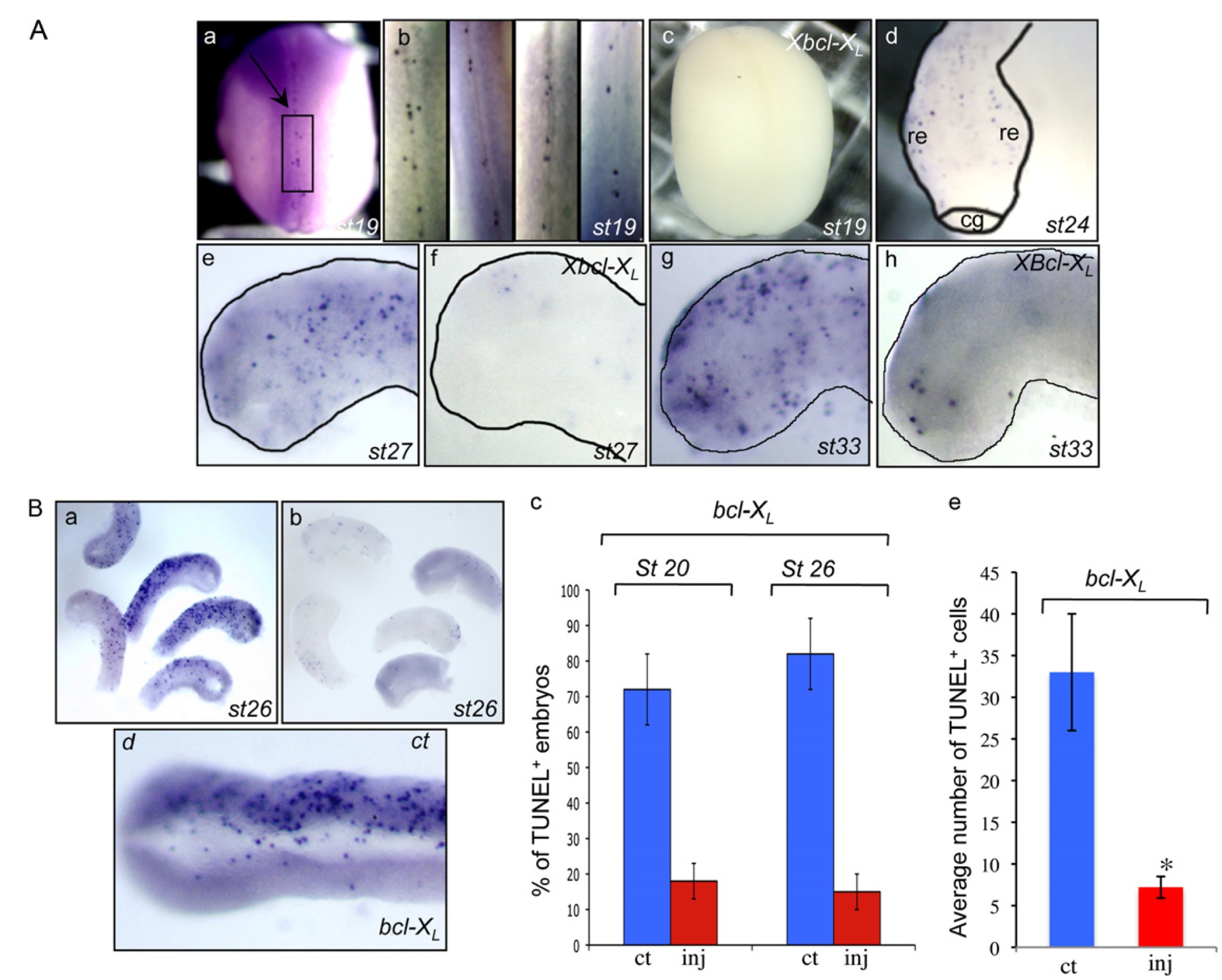 Fig. S2. From st 20 to 33, apoptotic nuclei are uniformly distributed in the anterior neural tube, and Bcl-XL overexpression protects anterior neural tube cells from apoptosis. (A) Apoptosis patterns. (a and b) TUNEL-positive cells occurred mainly along the dorsal closure line of the neural tube during neurulation (st 18â 20; 70%, n = 122). (d, e, and g) From st 20 to 33, cells died in the anterior part of the neural tube but were not confined to specific areas (n ⥠150 for each stage). (d ) WT representative embryos at st 24. Representative dissected neural tubes at (e) st 26â27 and (g) st 33. bcl-XL cRNA was injected into one dorsal blastomeres of four-cell embryos together with GFP as a tracer. TUNEL staining was performed on these embryos at (c) st 18â20, (f) 26 and 27, and (h) 33. (aâc) Dorsal view, anterior up; (b) an enlargement of WT st 19 embryos. (d) Anterior view, dorsal up. (eâh) Lateral view, anterior to the left. Re, retina; cg, cement gland. (B) Bcl-XL overexpression prevents apoptosis. (aâc) bcl-XL cRNA was injected into two dorsal blastomeres at the four-cell stage. TUNEL staining of (a) control or (b) bcl-XLâ injected representative dissected neural tubes is shown at st 26. (c) Comparison of the percentage of TUNEL-positive embryos (defined as having more than 30 apoptotic nuclei) at st 20 and 26 in control embryos (ct) and in embryos injected in the two dorsal blastomeres at the four-cell stage with bcl-XL cRNA (inj). Each experimental batch (n ⥠60) was assessed independently. (d and e) bcl-XL cRNA was injected into one dorsal blastomere at the four-cell stage. (d) TUNEL staining of a representative bcl-XLâinjected dissected neural tube is shown at st 26 (dorsal view, anterior to the left). (e) Average numbers of TUNEL-positive cells on the control or injected sides at st 26 of bcl-XLâinjected anterior neural tubes (forebrain to midbrain; n = 14, bcl-XLâinjected vs. ct, P ⤠0.002). |