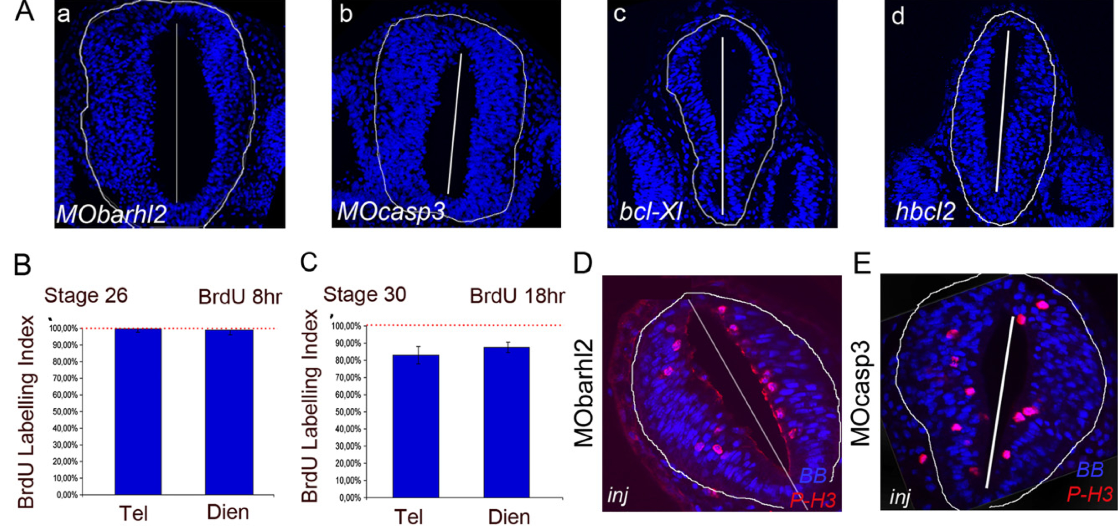 Fig. S4. Depletion of Barhl2 or Casp3 generates neural tube hyperplasia, an increase in the BrdU LI, and ectopic mitosis. (A) Depletion of Barhl2 or Casp3 generates neural tube hyperplasia. Xenopus embryos were injected with (a) MObarhl2-60 (60 ng), (b) MOcasp3-40 (40 ng), (c) bcl-XL cRNA, or (d) hbcl2 cRNA. Representative sections of st 26 embryos at the diencephalic level are shown dorsal side up. Cell nuclei are stained with BB. The white line indicates the midline of the neural tube and the limits of the neuroepithelium. The left side is the injected side. (B and C) Neuroepithelial cells all proliferate until st 26, and some neuroepithelial cells cease division after this point. The BrdU LI was measured after (B) 8 h starting at st 24 until st 26/27 or (C) 18 h starting at st 26/27 until st 30 of BrdU exposure in telencephalic and diencephalic sections. Each embryo was assessed independently. (B) Between st 24 and 27, 99.7% of telencephalic (n = 3) and 98.9% of diencephalic (n = 3) neural tube cells had incorporated BrdU and undergone at least one cell cycle. (C) Between st 26 and 30, only 84% of telencephalic (n = 3) and 88% of diencephalic (n = 3) neural tube cells had divided, arguing that some neuroepithelium cells had exited the cell cycle during this period. (D and E) Ectopic mitosis in Barhl2- and Casp3-depleted st 26 embryos. Representative sections of st 26 embryos at the diencephalic level, shown dorsal side up and immunostained for P-3H (red), merged with BB (blue) images. |
