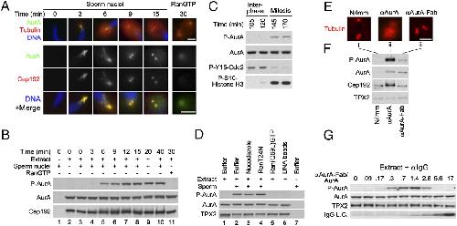 Fig. 1. AurA activation and MT assembly promoted in egg extract by sperm nuclei and αAurA beads. (A) Localization of AurA and Cep192 during MT assembly promoted by sperm nuclei-associated centrosomes (time course) and RanGTP. (Scale bars: 5 μm.) (B) W-blots showing the time course of AurA activation in extract by sperm nuclei (4 à 104/μL). (C) Extract was driven into interphase by the addition of calcium and supplemented with demembranated sperm nuclei (2 à 103/μL). Extract aliquots were withdrawn at the indicated times after sperm addition and analyzed by W-blotting using the indicated antibodies. (D) W-blots of extracts supplemented with XB buffer, nocodazole (50 μM), RanT24N (30 μM), Ran(Q69L)GTP (30 μM), or DNA beads (0.1 μL/μL). Where indicated, reaction mixtures contained sperm nuclei (4 à 104/μL). (E and F) Beads coated with nonimmune IgG (N/Imm), αAurA, or αAurA-Fab were incubated in rhodamine-tubulin+Ran(Q69L)GTP-supplemented extract and analyzed by fluorescence microscopy (E) and W-blotting (F). (Scale bar: 10 μm.) (G) W-blots of extract incubated with 1.7 μM goat anti-rabbit IgG, IgG fraction (αIgG) and increasing concentrations of αAurA-Fab [detected as IgG light chain (IgG L.C.)]. The concentration of AurA in egg extract is â0.35 μM.