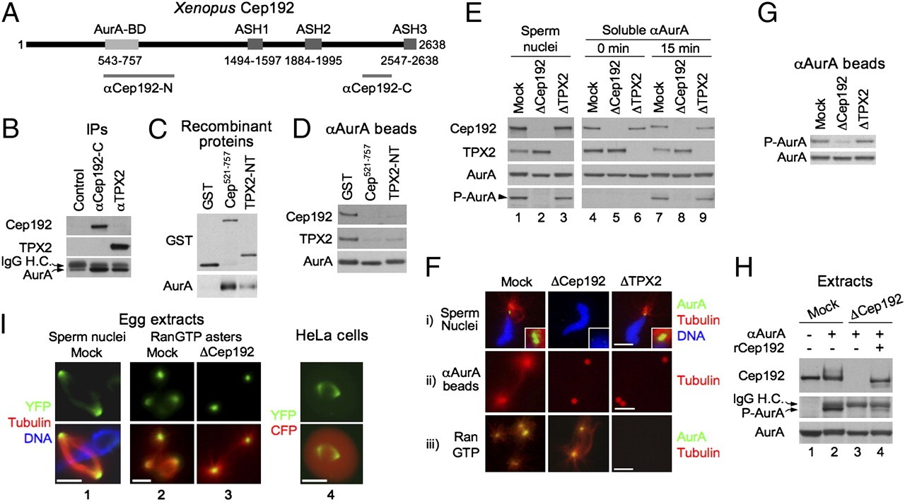Fig. 2. Cep192 is a cofactor of AurA at centrosomes. (A) Schematic diagram of Xenopus Cep192. The AurA-BD and the three ASH (ASPM, SPD-2, Hydin) domains (40) are shown. The numbers denote aa. The underlying gray lines indicate the polypeptides used for antibody production. (B) W-blot of Cep192 and TPX2IPs from extract. IgG H.C., IgG heavy chain. Note that the nonimmune IgG, even when used in approximately a twofold excess over αCep192-C and αTPX2 (as assessed by the intensity of IgG H.C.), brings down only a small, background amount of AurA. (C) Binding of recombinant Xenopus AurA to glutathione Sepharose-immobilized glutathione S-transferase (GST), GST-Cep521â757, and GST-TPX2-NT. (D) W-blot of αAurA beads retrieved from extracts incubated with 3 μM of the indicated GST polypeptides. (E) W-blot of mock-treated, Cep192-, and TPX2-depleted extracts incubated with 4 à 104/μL sperm nuclei (30 min) or with αAurA (0.3 μM) for the indicated times. (F) MT structures assembled in extracts supplemented with sperm nuclei, αAurA beads, or Ran(Q69L)GTP. (Scale bars: 10 μm.) (G) P-AurA and AurA detected by W-blot of αAurA beads retrieved from extracts in Fii. (H) W-blot showing partial rescue of the AurA activation defect by rCep192 in Cep192-depleted, fivefold diluted, extract. (I) Visualization of AurA oligomers by BiFC in extracts and transfected HeLa cells. BiFC complexes are shown in green; MTs (columns 1â3) and CFP (which denotes transfected cells; column 4, pseudocolor) in red; and DNA (DAPI; row 1) in blue. (Scale bars: 10 μm.)