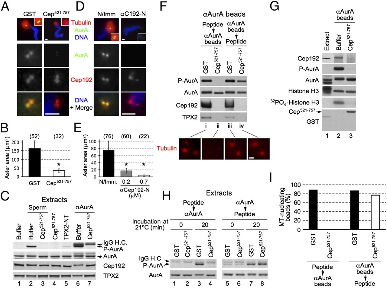Fig. 3. Cep192-mediated AurA activation is essential for MTOC function. (A and D) Localization of AurA and Cep192 on centrosomal asters assembled in extracts supplemented with 3 μM GST or Cep521â757 (A) or with 0.7 μM nonimmune IgG or αCep192-N (D). (Scale bars: 2.5 μm.) (B and E) Quantitation of MT aster surface area in A and D, respectively. The results obtained in the presence of 0.2 μM αCep192-N are also shown for comparison (E). Error bars, SD. *P < 0.0001 compared with the corresponding control extract, as determined by a two-tailed Student's t test. The number of asters analyzed is shown in parentheses. (C) W-blot of extracts incubated with XB buffer, Cep521â757 (3 μM), or TPX2-NT (6 μM) in the absence or presence of sperm nuclei (4 à 104/μL) or αAurA (0.6 μM). (F) W-blots and images of αAurA beads that were added to extract before (iii and iv) or after (i and ii) its incubation with 3 μM GST or Cep521â757 on ice. (Scale bar: 10 μm.) (G) In vitro kinase assay of endogenous AurA complexes isolated from egg extract incubated with XB buffer or Cep521â757 (3 μM). The reaction products were resolved by SDS/PAGE and transferred onto a nitrocellulose membrane, which was subjected to autoradiography (32PO4-histone H3 row) followed by W-blotting (the remaining rows). (H) W-blots of extracts incubated with soluble αAurA (0.5 μM) added either before (lanes 5â8) or after (lanes 1â4) incubation of extracts with 3 μM GST or Cep521â757 on ice. (I) Quantitation of MT-nucleating αAurA beads in F, Lower.