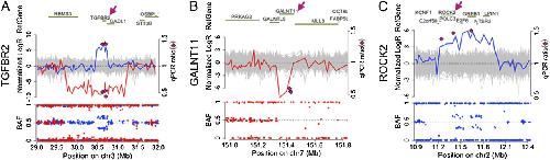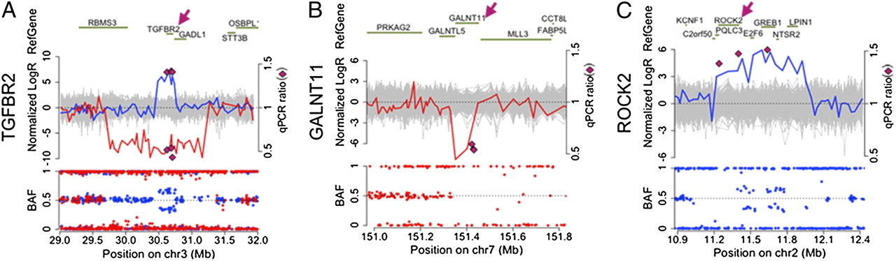 Fig. 2. Rare genic deletions and duplications in Htx patients. Results of Illumina genotyping and qPCR are shown for four CNVs at three loci that contain genes implicated in Htx. In all panels, genes in the indicated chromosome segment are shown and genes implicated in Htx are denoted by arrows. Data from subjects with deletion or duplications are shown in red or blue, respectively, and the remaining Htx subjects are depicted in gray. (Upper) Probe intensities in consecutive 10-SNP windows normalized to a mean of 0 and SD of 1 from values in the remaining Htx subjects. P values supporting CNVs are shown in Table S1. Ratios of results of qPCR in index cases compared with controls are shown as red diamonds. (Lower) B-allele fraction (BAF) of SNPs across the interval. Arrows indicate locations of implicated LR genes. (A) Independent deletion and duplication affecting TGFBR2 in subjects 28 and 139, respectively. (B) Deletion of first three exons of GALNT11 in subject 257. (C) Duplication of ROCK2 in subject 152.