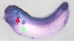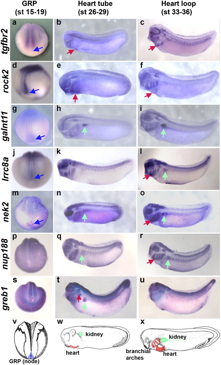 Fig. 3. WMISH analysis. (AâU) Results of in situ hybridization at three stages are shown for seven genes showing patterns of interest. These genes show expression in one or more of the following: GRP (blue arrows); heart or branchial arches (red arrows); kidney (green arrows). Stage 15 to 19 embryos are viewed dorso-posteriorly with anterior to the top to examine GRP expression (shown schematically in V). Stage 26 to 29 and stage 33 to 36 embryos are viewed laterally with anterior to the left (shown schematically in W and X, respectively).