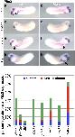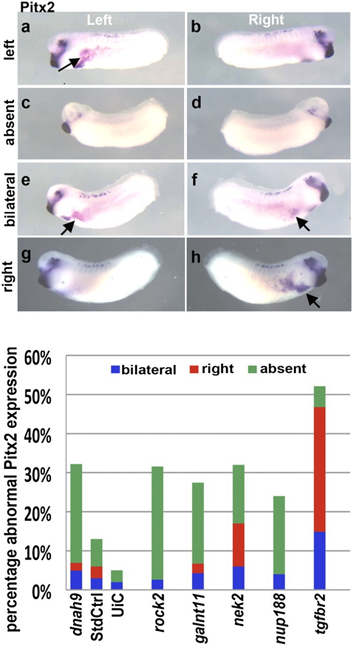 Fig. 5. Analysis of pitx2 expression in stage 28 to 30 Xenopus embryos. Embryos are viewed laterally from the left (first column) and the right (second column). Note normal, bilateral pitx2 expression in the head region in all embryos. (A) Expression of pitx2 is normally in the leftlateral plate mesoderm (LPM, arrow). (B) Same normal embryo showing absent pitx2 expression in the rightLPM. (C and D) Absent pitx2 expression. No pitx2 mRNA is found in the left or rightLPM. (E and F) Bilateral pitx2 expression. The pitx2 mRNA is found in both left and rightLPM (arrows). (G and H) Rightpitx2 expression: pitx2 mRNA is absent from the leftLPM, present in the rightLPM. (Graph) Summary of pitx2 mRNA expression in MO knockdown embryos: dnah9 is a positive control; StdCtrl, and UiC are negative controls. Bars show the percent of abnormal pitx2 expression and are divided into blue (bilateral), red (right), and green (absent) LPMpitx2 expression.