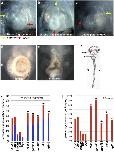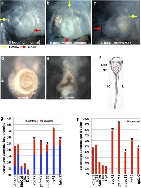 LR abnormalities from MO knockdown in X. tropicalis. MOs were injected at the one-cell stage and heart and gut looping were assayed in tadpoles at stage 45/46. Views are from the ventral aspect, shown in schematic form in F. (A) Heart (area outlined in red box as in schematic in F) showing normal D-looping. The inflow (red arrow) is on the tadpole's left, the outflow tract (yellow arrow) is on the tadpole's right. (B) Heart showing abnormal, anterior, A-looping. The inflow (red) and outflow (yellow) are both at the midline, with no discernible LR orientation. (C) Heart showing abnormal, reversed, L-looping. The inflow (red) is on the tadpole's right, the outflow (yellow) is on the tadpole's left. (D) Normal clockwise rotation of the gut. (E) Abnormal gut rotation. (F) Schematic of Xenopus tadpole at stage 45/46; ventral view with anterior to the top; arrows indicate heart and gut. (G) Heart looping in MO knockdown tadpoles. Both dnah9 and ift88 are positive controls; standard control MO (StdCtrl), uninjected control (UiC), and dye-injected (Dye) are negative controls. Bars show the total percentage of abnormally looped hearts: divided into A-loop (blue) and l-loop (red). (H) Gut looping in MO knockdown tadpoles. Both dnah9 and ift88 MOs are used as positive controls; StdCtrl, UiC, and Dye are used as negative controls. Red bars show the the percent of abnormal gut loops. Heart and gut looping were analyzed by two independent readers blinded to group status with 95% concordance. *P < 10−4 vs. StdCtrl.