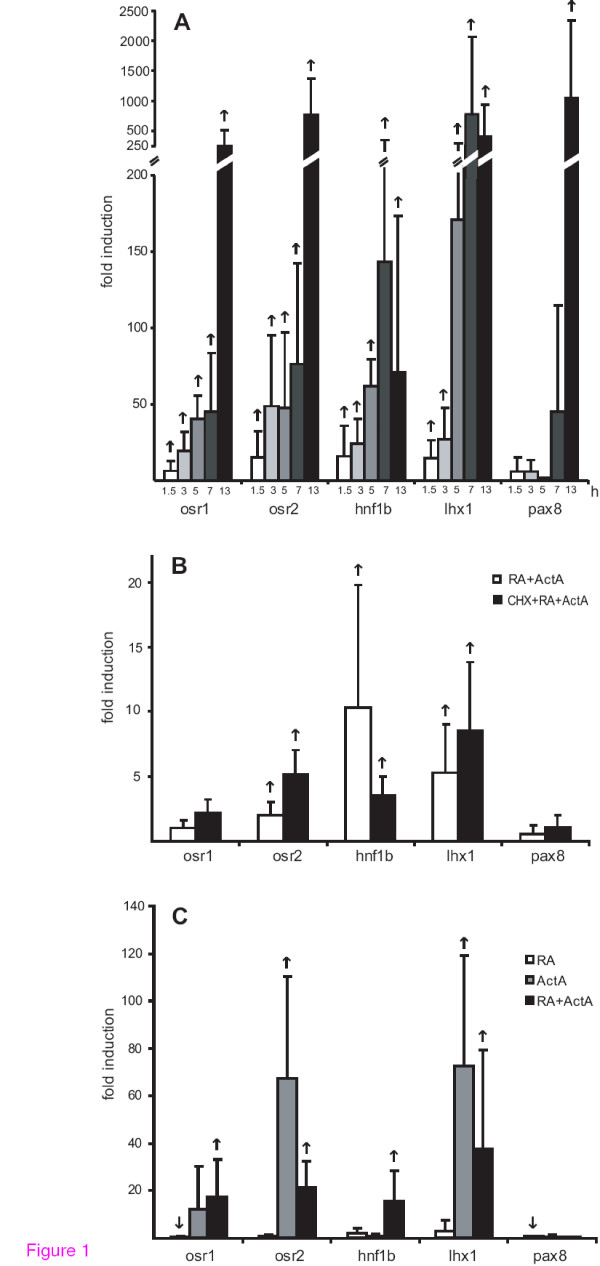 Figure 1. Time dependent induction of the early nephrogenic transcription factors in retinoic acid and activin A treated animal caps. (A) Animal caps were cut at the late blastula stage 9 [36] and incubated for 1.5 or 3 hours in retinoic acid (10-4M) and activin A (10 ng/ml). For 5, 7 and 13 hours treatments retinoic acid and activin A was replaced after three hours with Steinberg's solution [15]. The mRNA levels were analysed by quantitative RT-PCR using the primers given in Additional file 2. The standard deviations from four independent animal cap pools (N = 30) are given and alterations are indicated by an upward arrow, if all four induction values were higher than one for a given probe. To detect osr2 transcripts primers targeting osr2B, the splice variant predominantly expressed in Xenopus laevis (compare Figure 2Bs) were used for two animal cap pools analyzed after 3, 5 and 7 hours and three after 13 hours In all other experiments primers targeting both splice variants were used. (B) Animal caps cut at the late blastula stage 9 were incubated with or without cycloheximide (CHX, 5 μg/ml) for 30 min and then stimulated for 1.5 hours in retinoic acid (10-4M) and activin A (10 ng/ml). RNA was quantified from six pools (N = 30) and upward arrows indicate induction for all six experiments. (C) Animal caps were cultured for three hours in retinoic acid (RA, 10-4M), activin A (ActA, 10 ng/ml) or both inducers together (RA+ActA) and then analysed by quantitative RT-PCR. The standard deviations from five (RA) or four (ActA or RA+ActA) independent animal cap pools (N = 30) are given and reproducible induction or reduction is indicated by an upward or downward arrow, if increased or decreased in all samples, respectively.