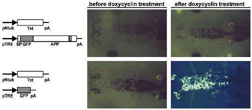 transgenic tadpoles after doxycyclin treatment (lower right panel). The transmembrane domain of APP is indicated by a dashed