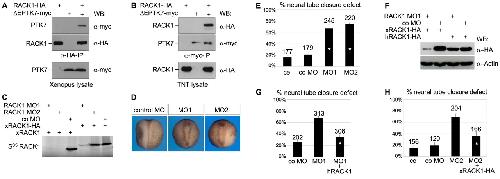 Fig. 1. RACK1 interacts with PTK7 in co-precipitation assays and is required for Xenopus neural tube closure. (A) RACK1 co-precipitates a deletion mutant of PTK7 that lacks the extracellular domain (δEPTK7) in lysates of embryos injected with 300 pg HA-tagged RACK1 RNA and 500 pg myc-tagged δEPTK7 RNA. WB, western blot. (B) In vitro translated myc-tagged δEPTK7 protein precipitates in vitro translated HA-tagged RACK1 protein. (C) RACK1 MO verification in radioactive in vitro translation assays. MO1 targets the ATG and MO2 the 5â²UTR of the Xenopus RACK1 mRNA. Both MOs inhibited the in vitro translation of full-length RACK1 containing the 5â²UTR (xRACK1), whereas a control MO (co MO) did not affect protein translation. The translation of an HA-tagged RACK1 construct lacking the 5â²UTR (xRACK1-HA), which contains only the MO1 binding site, is inhibited by MO1 but not MO2. The radioactive, translated RACK1 proteins (S35 RACK1) are shown. (D) Embryos injected with 20 ng MO1 or MO2 show neural tube closure defects, whereas an embryo injected with 20 ng co MO displays a closed neural tube. (E,G,H) Bar charts that summarize the average percentage of neural tube closure phenotypes from three independent experiments in D. The total number of injected embryos from all three batches and the s.e.m. are indicated for each condition/column. Neural tube closure defects were determined at stage 17/18. ce, uninjected control embryos. (E) Neural tube closure defects caused by 20 ng RACK1 MO1 or 20 ng MO2 are significantly different from phenotypes in embryos injected with 20 ng control MO (*, P<0.005, Student's t-test). (G) Human RACK1 (hRACK1) RNA (300 pg) rescues the neural tube closure defects caused by 10 ng RACK1 MO1. Asterisk indicates that neural tube closure defects are significantly different from effects in embryos injected with MO1 (P<0.005, Student's t-test). (H) Injection of 300 pg xRACK1-HA RNA lacking the MO2 binding site rescues the neural tube closure defects caused by 20 ng MO2. Asterisk indicates neural tube closure defects significantly different from effects in embryos injected with MO2 (P<0.01, Student's t-test). (F) The translation of an HA-tagged Xenopus RACK1 construct (xRACK1) was inhibited by RACK1 MO1 but not by a control MO in Xenopus lysates. By contrast, the translation of an HA-tagged human RACK1 construct (hRACK1-HA) was not affected by RACK1 MO1 or the control MO. Embryos were injected at the one-cell stage with 10 ng of the respective MOs in combination with 300 pg RACK1 RNA. At stage 11, cells were lysed and protein expression was detected by western blotting using anti-HA antibodies. Actin expression served as a loading control.