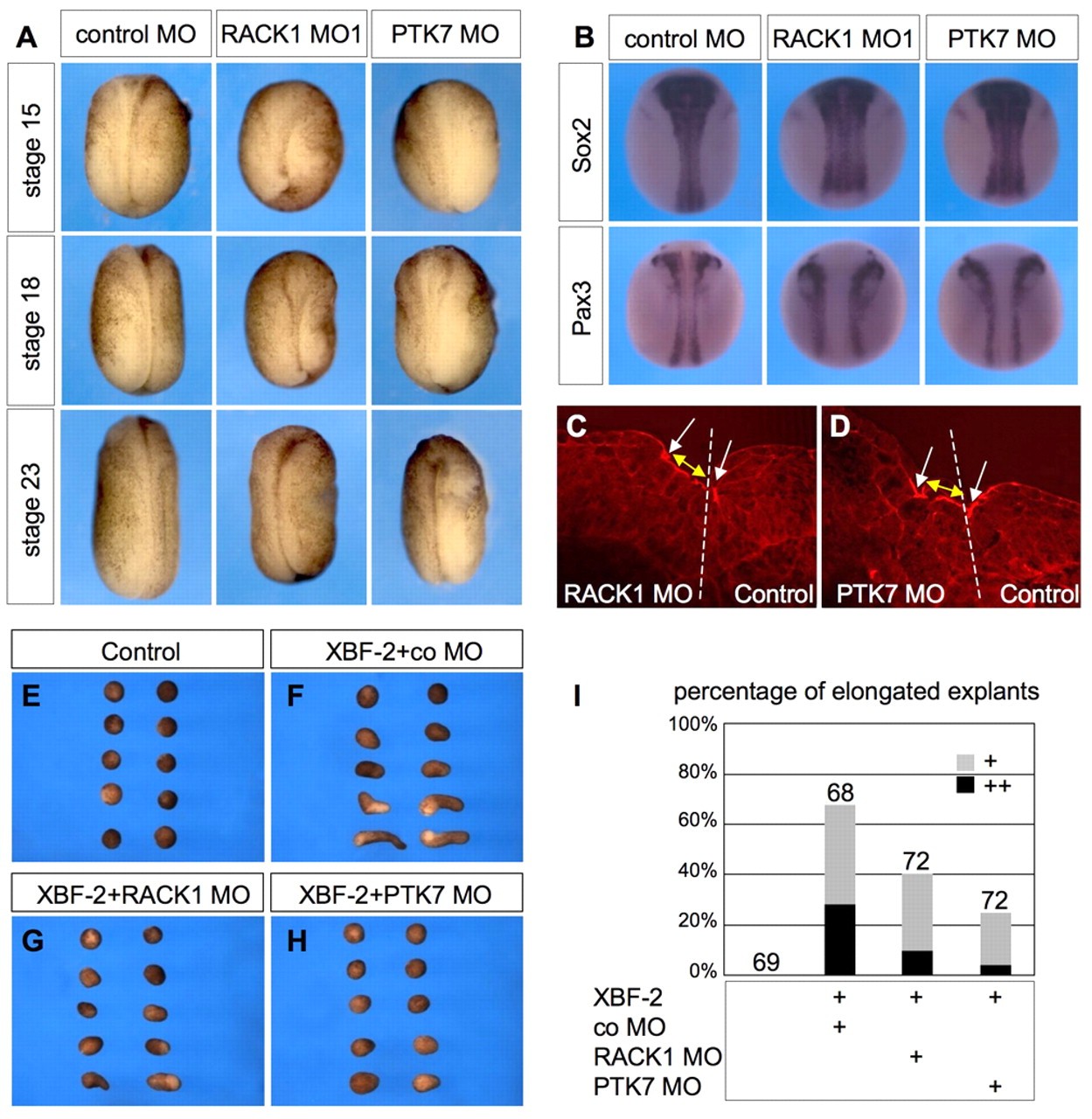 Fig. 2. RACK1 loss of function leads to similar neural tube closure defects as PTK7 loss of function. (A) Time-lapse images of Xenopus embryos injected with 10 ng control MO, RACK1 MO1 or PTK7 MO analyzed at stages 15, 18 and 23 show a similar delay in neural tube closure in the RACK1 and PTK7 morphants and the embryos remain shorter than the control. Embryos were injected at the one-cell stage and images were taken at 30-minute intervals from stage 13 to stage 23. (B) The expression of SOX2 (a pan-neural marker) and PAX3 (a lateral neural plate marker) is expanded in stage 17-18 embryos injected with 10 ng RACK1 MO1 or PTK7 MO compared with control MO. (C,D) Transverse sections of stage 18 embryos injected with 20 ng RACK1 MO or PTK7 MO. Embryos were injected in one blastomere at the two-cell stage; the dashed line demarcates the injected from the control side of the embryo. Phalloidin staining (red) marks the actin cytoskeleton. Actin accumulation, indicating hinge point formation (white arrows), is seen on the injected and control sides. However, the neural plate remains wide on the injected side (yellow arrow), indicating a defect in convergent extension. (E-H) Neural convergent extension was analyzed in ectodermal explants (animal caps) injected with 450 pg XBF-2 RNA. Explant elongation was analyzed when control embryos reached stage 20. (E) Uninjected control caps did not elongate. (F) Explants injected with XBF-2 and 20 ng control MO showed various degrees of elongation. (G) Co-injection of 20 ng RACK1 MO inhibited explant elongation. (H) Co-injection of 20 ng PTK7 MO inhibited elongation of explants. (I) The percentage of elongated explants from the experiments illustrated in E-H. Black indicates a strong elongation, gray a mild elongation. The number of explants is indicated for each condition.