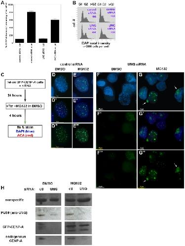 Figure 3. Loss of newly-made GFP-CENP-A after UNG-directed siRNA treatment is due to mislocalization and destabilization, not cell-cycle arrest or lack of synthesis.A. Quantitative real-time RT-PCR was used to detect levels of CENP-A transcript (endogenous and GFP-CENP-A combined) with and without UNG-directed siRNA or tetracycline. Percent CENP-A transcript levels were normalized against the sample with control siRNA without tetracycline. B. Cell cycle analysis was performed using high-content automated image quantitation, with and without UNG-directed siRNA or tetracycline. C–G. GFP-CENP-A cells were transfected with UNG-directed siRNA were treated with MG132 for 4 hours to prevent protein turnover. A scheme is shown in part C, example DMSO-treated control cell (D-D), example MG132-treated control cell (E-E). Example fields are shown for UNG-siRNA transfection with DMSO (F-F) or MG132 (G-G). Endogenous CENP-A was detected with human autoantisera (ACA) in red. H. Western blot analysis of protein levels demonstrates that GFP-CENP-A is selectively stabilized by MG132 treatment after UNG reduction by siRNA, while endogenous CENP-A protein levels remain low. |