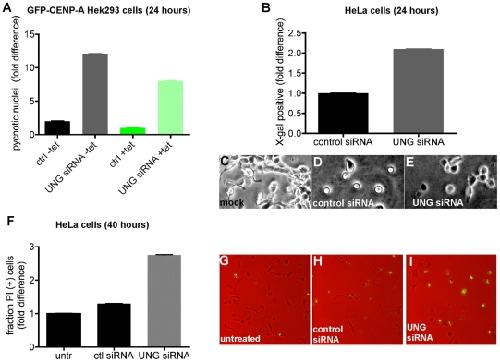 Figure 6. Depleting or inhibiting UNG resulted in apoptotic-like cell death after cell cycle.A. Manual quantitation ( cells per sample) of pycnotic (hypercondensed) nuclei detected in GFP-CENP-A cells using DAPI staining 24 hours after transfection with control or UNG-directed siRNA. Control uninduced cells (−tet) behaved similarly to induced (+tet) cells. B. Manual quantitation ( cells per sample) of X-gal staining detected in HeLa cells 24 hours after transfection with control or UNG-directed siRNA. Example images are shown in C–E. F. Manual quantitation ( cells per sample) of propidium iodide (PI) staining of dead cells detected in HeLa populations 40 hours after transfection with control or UNG-directed siRNA. Example images are shown in G–H. |