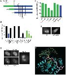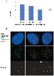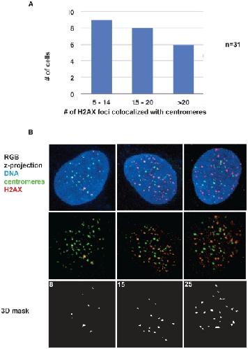 Figure 9. Quantitative analysis of phosphorylated H2AX signals colocalized with centromeres.A. Binned categories of cells (nâ=â31 cells) with significant numbers of phospho-H2AX foci colocalized with centromeres. B. Example deconvolved high-resolution images of 143b cells in each bin. Colocalization of centromeres detected with ACA (green), phospho-H2AX was detected with a monoclonal antibody (red), shown with DNA (blue, top row) or a mask of the measured 3-dimensional overlap above threshold (white, bottom row). |