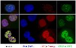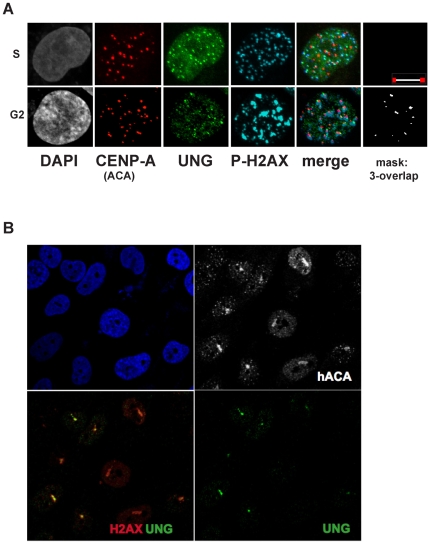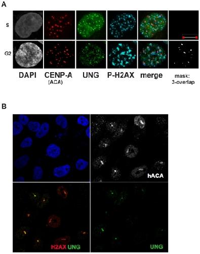 Figure 10. Endogenous UNG2 transiently colocalizes with CENP-A and phospho-H2AX at centromeres and lines of laser damage.A. Example deconvolved high-resolution images of 143b cells exhibiting different patterns of UNG2 localization. Top row images resemble S-phase replication foci with colocalization of UNG2 (green) with phospho-H2AX(blue) but not with CENP-A (red). Bottom row images demonstrate detectable three-way colocalization of CENP-A (red) with UNG2 (green) with phospho-H2AX (blue), as indicated by the measured overlap mask (white). Scalebarâ=â10 m B. Example confocal images of 143b cells subjected to laser exposure using methods described elsewhere [7]. Top left, nuclei detected with DAPI (blue). Bottom left, colocalization of phospho-H2AX (red) with UNG2 (green) in lines of laser damage. Top right, endogenous CENP-A (detected with ACA) is shown alone (white) to mark the lines of laser damage and centromeres (foci). Bottom right, UNG2 channel alone (green). |