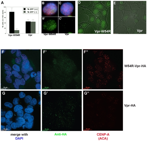 Figure 1. Transient transfection to induce Vpr expression destabilizes both endogenous and GFP-CENP-A.A. Manual quantitation of GFP-CENP-A cells after transfection with control Vpr mutant W54R or wild-type Vpr. B–C. Example images of cells transfected with control Vpr-W54R-HA (B-B) or wild-type Vpr-HA (C-C) detected with anti-HA in red, DNA in blue, and GFP-CENP-A in green. GFP-CENP-A channel is also shown alone (B and C). D–E. Example fields of live GFP-CENP-A cells transfected with Vpr-W54R (D) or wild-type Vpr (E). F–G. Example fields of fixed HeLa cells after transfection with Vpr-W54R (F-F) or wild-type Vpr (G-G). Vpr is detected with anti-HA in green. Endogenous CENP-A is detected with anti-centromere autoantisera (ACA) in red. |