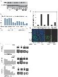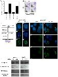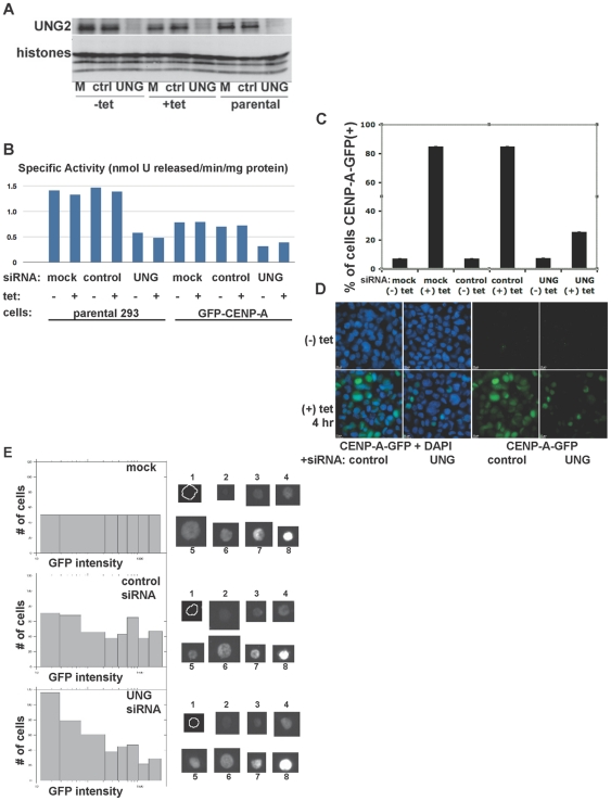 Figure 2. Transient transfection of UNG-directed siRNA destabilizes both endogenous UNG2 and GFP-CENP-A.A. Western blot analysis of UNG2 protein levels (top) and endogenous histones as a loading control (bottom) in parental Hek293 cells, uninduced or induced to express GFP-CENP-A. B. Specific activity of cellular extracts for uracil removal with and without transfection of control or UNG-directed siRNA. Parental Hek293 cells, uninduced (-tet) cells and mock transfected cells were used as controls. C. Manual quantitation of GFP-CENP-A cells with and without transfection of UNG-directed siRNA. Uninduced (-tet) cells were used as controls. D. Example images of cells used for quantitation shown in part C. DNA was detected with DAPI (blue) to identify nuclei. E. High-throughput (n = 5000 cells per well, 3 wells per sample) automated quantitation (left) and example images (right) using samples generated by the same methods used in parts C and D. |