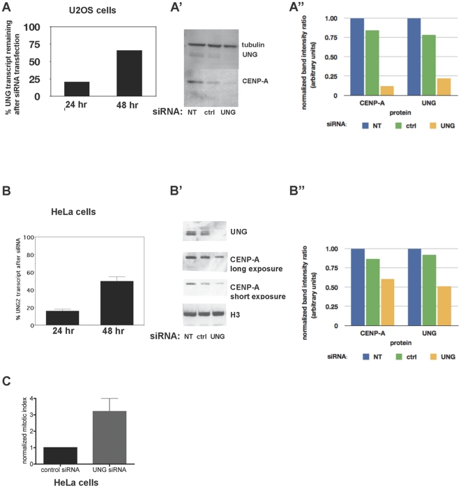 Figure 4. UNG-directed siRNA destabilizes endogenous CENP-A in U20S and HeLa cells.A. Quantitative real-time RT-PCR was used to detect levels of UNG transcript remaining after siRNA transfection in U20S cells. A. Western blot analysis of endogenous UNG2 and CENP-A protein levels 48 hours after siRNA transfection in U20S cells. Tubulin was detected as a loading control. A. Normalized band intensity for part A. B. Quantitative real-time RT-PCR was used to detect levels of UNG transcript remaining after siRNA transfection in HeLa cells. B. Western blot analysis of endogenous UNG2 and CENP-A protein levels 24 hours after siRNA transfection in HeLa cells. Histone H3 was detected as a loading control. B. Normalized band intensity ratios for part B. C. Normalized mitotic index of HeLa cells 24 hours after transfection with control or UNG-directed siRNA ( cells per sample). (unpaired t-test). |