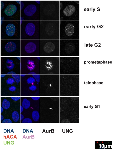 Figure 7. Cell cycle staging of UNG2 localization during G2 using indirect immunofluorescence.Example images from high-resolution confocal imaging using four channels. Left column, DNA was detected with DAPI (blue), endogenous CENP-A with ACA (red), and endogenous UNG2 with PU59 (green). Second column from the left, Aurora B was detected with Cy5 (pink) shown here with DNA (blue). Aurora B and UNG2 channels are shown alone in grayscale for clarity. Note the presence of Aurora B in the second row, indicating that UNG2 foci resembling centromeres are prominent during early G2. |