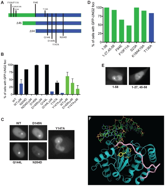 Figure 12. Requirements for UNG2 accumulation at sites of DNA damage.A. Schematic representation of truncations and point mutations tested in this study. B. Percent of cells with GFP-UNG2 foci at sites of laser-induced damage are shown, along with example images of the full-length catalytic site mutants. Full-length mutants (black bars) were all competent for accumulation, except for Y147A. 46 truncations (green bars) exhibited decreased focus formation. 94 truncations (blue bars) were consistently the least competent, particularly the D145N and N204D versions. C. Example images of full-length mutants shown in part C. D. Percent of cells with GFP-fusion foci at sites of laser-induced damage, using N-terminal peptides lacking the catalytic domain (example images in part E), or non-catalytic point mutations in full-length UNG2. E. Example images of two mutants shown in part D. F. Molecular dynamics model showing that the N-terminal residues of UNG2 (residues 65–85; pink), could potentially interact with the catalytic domain (structures 1AKZ, 1EMH, 1SSP, [27], near active site residue Y147 (pink). |