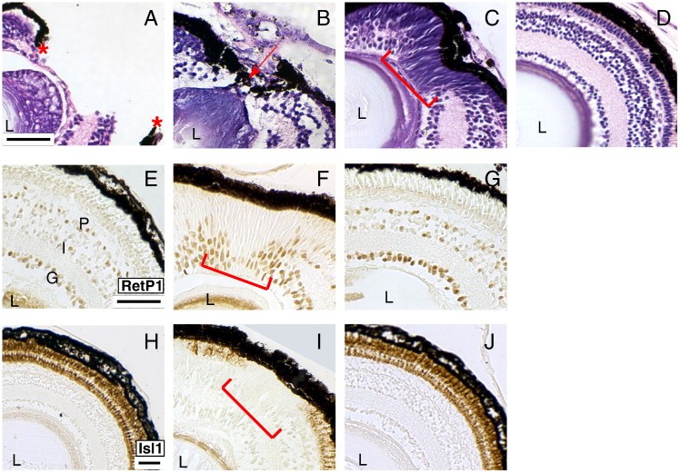 Fig. 1. The retina is essentially regenerated 30 days after resection. (AâD) The progress of regeneration was analyzed by hematoxylin and eosin staining. (A) The retina after resection of the nasal-dorsal quarter on day 1. The site of resection is evidenced by the disruption of the retinal lamination and RPE (red asterisks). (B) On post-resection day 3 the RPE has re-assembled around the site of resection (red arrow) and cells have begun to fill in the wound. (C) On post-resection day 13 the RPE has closed around the wound (red arrow) and RPCs have repopulated the wound. (D) On post-resection day 30 the lamination of the retina is completely restored and the resection site is no longer evident. (EâJ) Analysis of regeneration progress using markers of differentiated neural cell types. Immunolabeling for Islet-1 (EâG) and Rhodopsin (HâJ) in control retinas (E, H) and regenerating retinas at 15 days (F, I) and 30 days post-resection (G, J). Control retinas shown in panels E and H are from sibling embryos to those shown in panels G and J, respectively. At 15 days post-resection, the putative RPCs are still present at the site of resection (F, I; red bracket). The putative RPCs are not immunoreactive to Islet 1 (F; red bracket) or Rhodopsin (I; red bracket) antibodies. At 30 days post-resection, the putative RPCs are absent from the nasal-dorsal quarter of the retina and complete retinal lamination is observed by immunoreactivity to Islet-1 (G) and Rhodopsin (J). Uninjured retinas lack putative RPCs in the nasal-dorsal quarter and show Islet-1 and Rhodopsin immunoreactivities (E, H). L â lens; G â ganglion cell layer, I â inner nuclear layer; and P â photoreceptor layer. Scale bar = 50 μm. |