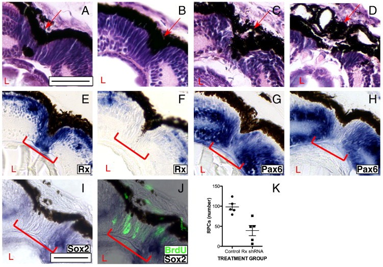 Fig. 3. Retinal regeneration is abnormal in Rx knockdown tadpoles. (AâD) Histological staining of regenerating retinas of a control non-transgenic tadpole (A), a control shRNA transgenic tadpole (B), and Rx shRNA transgenic tadpoles scored at 9 days post-resection (C, D). Rx shRNA transgenic tadpoles display shorter and/or rounder RPCs that are sometimes disorganized (C) and incompletely re-formed, disorganized RPE (D). (EâH) Rx (E, F) and Pax6 (G, H) expression is markedly reduced in the cells that repopulate the wound in Rx shRNA transgenic tadpoles. In situ hybridization on retinal sections of regenerating retinas from Rx shRNA transgenic tadpoles (F, H) and control non-transgenic tadpoles (E, G). Rx expression is markedly reduced in the cells that repopulate the wound in Rx shRNA transgenic tadpoles, but is not reduced in the Rx expressing cells at the INL (F). Pax6 expression is also reduced in the cells repopulating the wound in Rx shRNA transgenic tadpoles, but not in the INL or GCL (H). (I, J) Expression of Sox2 is also markedly reduced in the cells that repopulate the wound (I, red bracket). (J) Overlay of panel I with BrdU incorporation visualized by immunofluorescence (fluorescent green color). Arrow indicates RPE at the wound site; bracket indicates RPCs at the wound site. Scale bar = 50 μm. (K) Number of RPCs in the wound sites of regenerating retinas from control nontransgenic or Rx shRNA transgenic tadpoles. Each dot represents the RPC count from a single regenerating retina. The horizontal bar represents the average of the 5 counts shown; the vertical bar represents standard deviation from the mean for each group. |