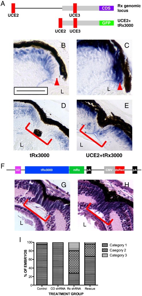 Fig. 4. The effects of Rx knockdown on regeneration can be rescued by mouse Rx. (A) Upper construct: schematic of the X. tropicalis Rx (tRx) genomic locus showing the relative positions of ultraconserved genomic elements UCE2 and 3 (red) within the tRx regulatory region (gray). The Rx coding region (CDS) is indicated (blue). Lower construct: transgene containing a 3 kb portion of the X. tropicalis Rx locus (tRx3000), UCE2, and a GFP expression cassette (green). (BâE) In situ hybridization using a GFP antisense riboprobe using sections of uninjured (B, C) or regenerating transgenic tadpoles (D, E). The tRx3000/GFP transgene is not expressed in the RPCs at the distal tip of the CMZ (B, red arrowhead) or RPCs at the center of the regenerating wound (D). Addition of UCE2 drives transgene expression in RPCs throughout the CMZ (C) and the regenerating wound (E). (F) Schematic of mRx rescue construct, containing X. tropicalis Rx transcriptional regulatory elements as shown in (A) and the mouse Rx coding region (green). (G, H) Hematoxylin and eosin staining of retinal sections from a non-transgenic tadpole (G) and a Rx shRNA+ rescue tadpole (H) at day 9 post-resection. (I) Quantification of regeneration impairment in Rx shRNA transgenic tadpoles relative to nontransgenic controls, control (CO) shRNA transgenic tadpoles, and tadpoles co-transgenic for mRx. Categories of phenotype severity are defined in Table 1. Scale bar = 50 μm. |