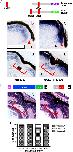 Fig. 2. The regenerating wound is populated by retinal progenitor cells and is organized similarly to the CMZ. (AâC) In situ hybridization performed using retinal sections of embryos at 9 days post-resection. Cells filling the regenerating wound express pan-RPC markers Rx1A (A), Pax6 (B), and Sox2 (C). (D, E) Cells filling the regenerating wound are proliferating. Immunolabeling of regenerating retinas at 9 days post-resection with anti-BrdU antibody. The putative RPCs incorporate BrdU and are immunoreactive to the anti-BrdU antibody (E, red bracket). The nasal-dorsal quarter of an uninjured retina lacks proliferating RPCs (D). (F, G) In situ hybridization performed on sections of embryos at 9 days post-resection with riboprobes for Notch1 (F) or NeuroD (G). (H) Double in situ hybridization for Notch1 (blue) and NeuroD (red). Different subsets of the RPCs (red) express Notch1 and NeuroD. Notch is expressed closer to the center of the wound (H; blue brackets) than NeuroD (H; red brackets) confirming that the expression of these two markers begins in different subsets of the RPCs that repopulate the wound. (I, J) The cyclin-dependent kinase inhibitor Xic1 is expressed at the extreme periphery of the regenerating region. (I) In situ hybridization for Xic1 (red brackets) demonstrates expression at the periphery of the regenerating wound and not in the center (blue bracket). (J) Overlay of BrdU incorporation (fluorescent green) and Xic1 in situ hybridization from (I). Proliferating cells are largely in the center of the regenerating wound (blue bracket), with little overlap with cells expressing Xic1 (red brackets). (K) Left â Model of normal CMZ (adapted from Perron et al., 1998). Right â Model of the CMZ formed in the regenerating wound. Scale bar = 50 μm. |