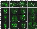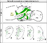 Figure 6. Schematic drawings of sagittal and coronal sections through a premetamorphic brain of Xenopus laevis illustrating the distribution of Nkx2. 2 expressing zones (green regions in the sagittal view) and cells (green dots in the coronal view) along the forebrain. The appropriated levels of the coronal sections are indicated in the sagittal view. Abbreviations as in Figure 1. |