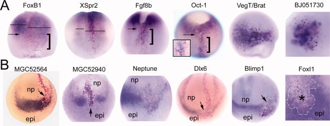 Figure 2. Whole mount in situ hybridization assays of embryos injected with FoxD4L1/D5 mRNA. A: Examples of FoxD4L1/D5 causing an increase in downstream gene expression. In neural plate stage embryos, the expression domains of FoxB1 and XSpr2 are broader on the FoxD4L1/D5-injected side (right; indicated by βGal-expressing (red) cells). Lines indicate width of neural plate on injected (right) and control (left) sides of embryos. Dorsal views with anterior to the bottom. The FoxB1 expression domain also extends more anterior (bracket) compared to anterior limit on control side (arrow). At gastrula stages, the endogenous domains of Fgf8b and Oct-1 surround the yolk plug; the anterior extent of the domain is indicated by an arrow on the control side. The cells expressing FoxD4L1/D5 (red nuclei) in the neural plate (bracket) also express increased levels of Fgf8b and Oct-1. Dorsal views with anterior to the bottom. Inset in Oct-1 embryo: higher magnification showing FoxD4L1/D5-cells with red nuclei and blue cytoplasm. At gastrula stages, VegT/Brat and BJ051739 are ectopically induced in the animal cap ectoderm. Animal pole views. B: Examples of FoxD4L1/D5 causing a decrease in downstream gene expression. In neural plate stage embryos, MGC52564, MGC52940, Neptune, Dlx6, and Blimp1 are expressed in the border zone that separates the anterior neural plate (np) from the epidermis (epi). For each gene, this region shows decreased expression at the site of FoxD4L1/D5-expressing cells (red nuclei, arrows). MGC52564, MGC52940, Dlx6, Blimp1 are anterior views with dorsal to the top; control side is on the left. Neptune is a side view with anterior to top and dorsal to right. In a gastrula embryo, the normal high level of FoxI1 expression in the animal cap ectoderm (epi) is greatly reduced in the FoxD4L1/D5-expressing clone (*), which is outlined for clarity. |