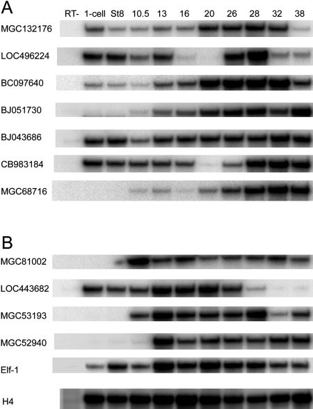 Figure 3. RT-PCR assays illustrate the temporal expression patterns of uncharacterized up-regulated (A) and down-regulated (B) genes in normal, unmanipulated embryos. RT-, minus RT step; numbers across the top indicate the developmental stages (st). H4 is an internal control. |