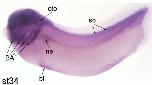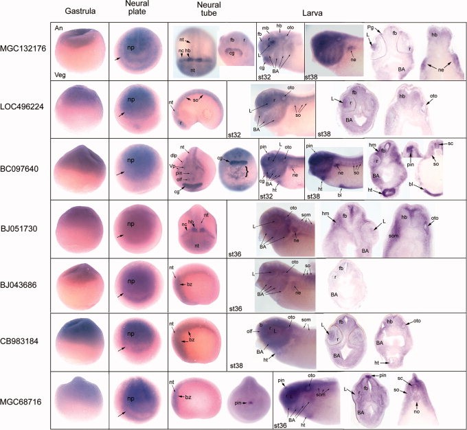Figure 4. Whole mount in situ hybridization assays illustrating the expression patterns of 7 uncharacterized genes that are up-regulated by FoxD4L1/D5. Gastrula stages are side views oriented with animal cap (An) to the top and vegetal pole (Veg) to the bottom. Transcripts for all 7 genes are detected in the animal cap ectoderm. At neural plate stages, embryos are oriented in an anterior frontal view, with dorsal to the top. Transcripts for all 7 genes are detected in the neural plate (np) and in the ectoderm bordering the neural plate (arrow) that will give rise to the cranial placodes and neural crest. At neural tube stages, MGC132176 is expressed throughout the neural tube (nt), with intense staining in a band in the midbrain-hindbrain (hb) region, in adjacent neural crest (nc), and the dorsal rim of the cement gland (cg). Left embryo is a dorsal view with anterior at the bottom and right embryo is a ventral view of the head. At larval stages (st328), MGC132176 is detected throughout the brain and retina (r), in the lens (L), otocyst (oto), cement gland, branchial arch (BA), and nephric mesoderm (ne). This and all larval stages are side views with anterior to the left. Transverse sections of st38 embryo confirm the labeled tissues identified in whole mount embryos, and identify the profundal ganglion (Pg). At neural tube stages, LOC496224 is expressed throughout the neural tube, retina, and somites (so). Side view with anterior to the left. At larval stages, LOC496224 is additionally expressed in the lens, otocyst, and branchial arches. BC097640 is expressed throughout the neural tube, with strong expression in the pineal primordium (pin), cement gland, several cranial placodes (dlp, dorso-lateral placode; olf, olfactory placode; Vp, trigeminal placode), and scattered cells on the ventral midline (bracket) caudal to the cement gland. Left embryo is an anterior frontal view with dorsal to the top; right embryo is a ventral view with anterior to the top. At larval stages, BC097640 is additionally expressed in the lens, otocyst, branchial arches, head mesoderm (hm), heart (ht), ventral blood islands (bl), somites, and nephric mesoderm. At neural tube stages, BJ051730 is weakly expressed throughout the neural tube, with strong expression in the midbrain-hindbrain region and adjacent neural crest. Dorsal anterior-view from the top. At larval stages, BJ051730 is additionally expressed in the lens, otocyst, branchial arches, somites, and nephric mesoderm. At neural tube stages, BJ043686 is expressed in the neural tube and the ectoderm bordering it (bz). Side view with anterior to the left. At larval stages, BJ043686 is additionally expressed at low levels in the lens, otocyst, somites, branchial arch, head, and nephric mesoderm. At neural tube stages, CB983184 is expressed in the neural tube and the ectoderm bordering it. At larval stages, CB983184 is additionally expressed in the olfactory pit, lens, retina, otocyst, somites, branchial arch mesoderm, and heart. At neural tube stages, MGC68716 is expressed in the neural tube, the ectoderm bordering it, and pineal primordium. At larval stages, MGC68716 is additionally expressed in the otocyst, somites, branchial arch mesoderm, and heart. fb, forebrain; mb, midbrain. |