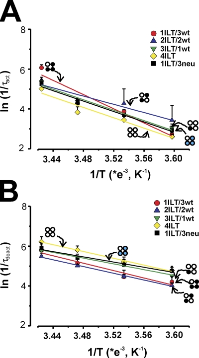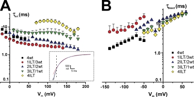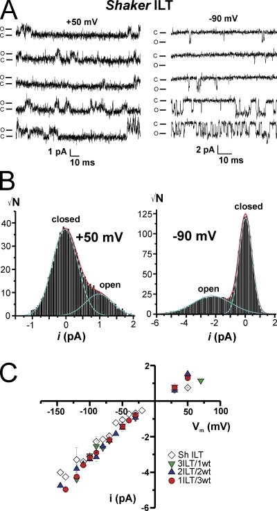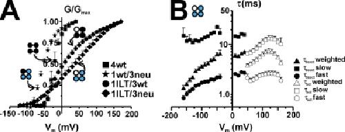 The contribution of individual subunits to the coupling of the voltage sensor to pore opening in Shaker K channels: effect of ILT mutations in heterotetramers.