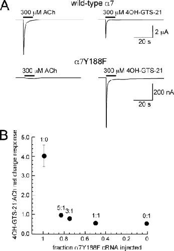 Figure 3. Probing for an α7 C-loop mutation with selective and nonselective agonists. (A) Mutation of the α7 tyrosine 188 to phenylalanine reduces sensitivity to low concentrations of ACh, with little impact on sensitivity to the responses to the α7-selective agonist 4OH-GTS-21 (Horenstein et al., 2007). The upper traces are representative responses of oocytes expressing wild-type α7, for which 300 µM 4OH-GTS-21 evoked responses that are 57 ± 4% the magnitude of the responses evoked by 300 µM ACh, in net charge. In contrast, for oocytes expressing α7Y188F, 300-µM 4OH-GTS-21–evoked net charge responses that are 405 ± 55% of the magnitude of the responses evoked by 300 µM ACh. (B) Oocytes were injected with RNA for α7Y188F and wild-type α7 at (mutant/wild-type) 1:0, 5:1, 3:1, 1:1, and 0:1 ratios and then tested for their relative responses to 300 µM ACh and 300 µM 4OH-GTS-21. The values are plotted in relation to the fraction of α7Y188F RNA injected at each ratio and are the means ± SEM of at least four oocytes for every condition.