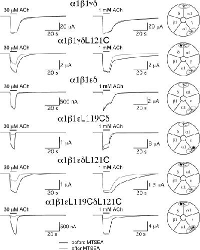 Figure 4. The effect of MTSEA on muscle-type receptors with mutations homologous to α7L119C in muscle δ, γ, and ε subunits. Representative responses obtained before MTSEA treatments are shown as black lines, and responses obtained after MTSEA are shown as gray lines. The schematics to the right of the traces represent the subunit composition and disposition of the ACh binding sites for the different receptor subtypes. The asterisks represent the location of the mutations in the complementary face of the agonist binding site.