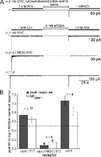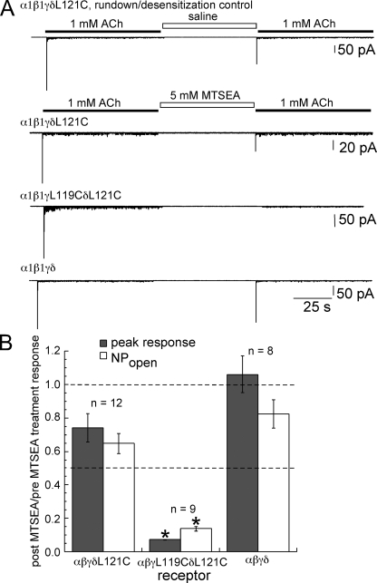 Figure 6. The effect of MTSEA treatment on peak and NPopen responses from receptors expressed in BOSC 23 cells. (A) Example traces of outside-out patches from each condition. A rapid (≤0.7-ms) drug application system was used to apply ACh and MTSEA. (B) Summary of the effect of MTSEA treatment (5 mM for 60 s) on peak current and NPopen responses to 1 mM ACh shown as the average of post-MTSEA measurements relative to the pre-MTSEA measurements of each patch. The measurements are normalized to the average peak current and NPopen responses from eight rundown/desensitization control patches. Asterisks above the values for α1β1γL119CδL121C indicate statistical significance (P < 0.01) when compared with values from either α1β1γδL121C or wild-type. See Table III for values.