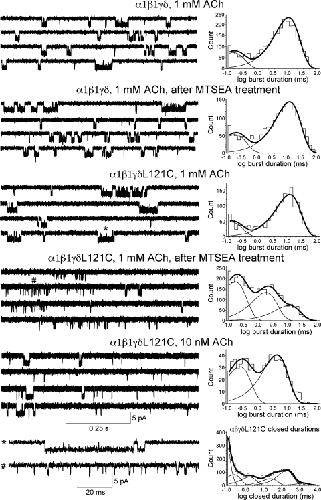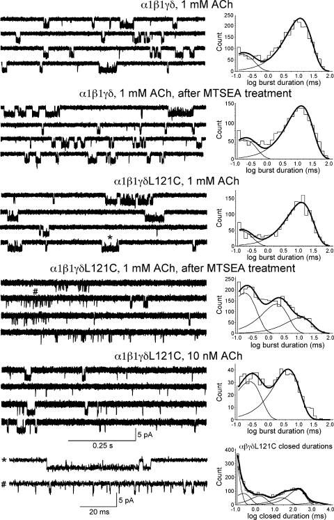 Figure 7. Single-channel traces and fit burst–duration histograms from wild-type α1β1γδ and α1β1γδL121C receptors before and after MTSEA treatment (5 mM for 60 s) as indicated. Bursts from α1β1γδL121C receptors before and after MTSEA treatment (indicated by * or #) are shown on the bottom row in higher time resolution together with the closed-duration histogram from α1β1γδL121C (before MTSEA treatment) used to define bursts. Currents were sampled at 100 kHz and ultimately low-pass filtered to 5 kHz. Each histogram represents the data pooled from at least individual four patches recorded under identical conditions, except for the 10-nM ACh concentration histogram, where data were pooled from three patches. Fit parameters are listed in Table IV.