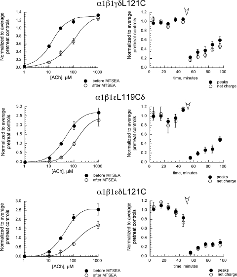 Figure 5. ACh concentration–response data for muscle-type single-subunit mutants before and after MTSEA treatment. Oocytes were stimulated alternately with control applications of 30 µM ACh and ACh at increasing concentrations: 1 µM, 10 µM, 100 µM, and 1 mM (i.e., the sequence of applications was 30, 1, 30, 10, 30, 100, 30, 1,000, and 30). Next, the oocytes were treated with 2 mM MTSEA for 60 s before being tested with the same sequence of ACh applications. All of the data were normalized to the individual oocytes’ average responses to the five 30-µM ACh applications given before the MTSEA treatment. Therefore, the 30-µM point in the pretreatment data is fixed at 1, and the SEM plotted for that point is the average SEM of the five 30-µM responses obtained from each cell. The 30-µM point in the post-MTSEA curve is based on the responses to 30 µM ACh obtained between the posttreatment 10-µM ACh and 100-µM ACh applications. The plots on the right represent the repeated 30-µM ACh responses obtained through the course of the entire experiments, normalized to the average pre-MTSEA 30-µM ACh responses from each cell. The arrowhead indicates the point at which MTSEA was applied. The values plotted are the means ± SEM of five, three, and eight oocytes for α1β1γδL121C, α1β1εL119Cδ, and α1β1εδL121C, respectively. Fit parameters are listed in Table II.
