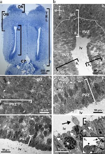 Fig. 1. Ultrastructural analysis of the anterior telencephalon. a Horizontal slice of the telencephalon of larval X. laevis stained with Methylenblue-Azur II. b Transmission electron microscopy of the anterior part of the lateral telencephalic ventricles with its PVZ and the posterior part of the granule cell layer of the OB (b1). Various electron micrographs were assembled into a photo montage to obtain this overview. The dotted line indicates the approximate border between the PVZ and the granule cell layer of the OB. The brackets indicate the approximate location of the areas shown at higher magnification in b2 through b4. Anterior part of the PVZ and adjacent granule cell layer of the OB (b2). Cell divisions are frequent in the PVZ. Note the cell with decomposed nuclear envelope and condensed DNA in form of chromosomes (asterisk). Medial part of the PVZ (b3) and lateral part of the PVZ (b4). The brackets in b2through b4 include the cell layers of the anterior, medial, and lateral PVZ, respectively. b5 shows a higher magnification of cells in direct contact with the lumen of the lateral ventricles. Two cells are in mitosis (asterisks). The white arrows indicate accumulations of mitochondria very close to the ventricular lumen. The black arrow shows a large cellular protrusion into the ventricle. The area included in the bracket is shown at higher magnification in b6. Note the multivesicular protrusion into the ventricle (arrowhead) and the single cilium extending into the cerebrospinal fluid (arrow). Abbreviations: ON olfactory nerve, OB olfactory bulb, PVZ periventricular zone, TEL telencephalon, CP choroid plexus, lv lateral ventricle, gcl granule cell layer |