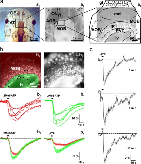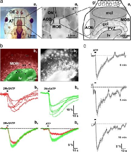 Fig. 3. Nucleotide-induced [Ca2+]i increases in cells of the anterior telencephalon. a Overview of a head of larval X. laevis (a1). The black rectangle indicates the location of the anterior telencephalon. An acute slice preparation of the telencephalon is shown in a2. The black rectangle indicates the approximate location of the Fura-2/AM stained slice shown in a3 (brightened fluorescence image acquired at rest). b Fura-2/AM stained slice preparation (the same as shown in a3) with the area of the OB shaded in red, and the PVZ shaded in green (b1). Pixel correlation map of the same slice (see âMaterials and methodsâ section for details) obtained upon application of 2MeSATP (5 μM; b2). The ventricle appears to respond as a whole. This results from responses of ependymal cells from the floor of the lateral ventricle. The 2MeSATP-induced [Ca2+]i transients of six individual cells of the OB (see black dots in the red-shaded area in b1) and the PVZ (see black dots in the green shaded area in b1) are shown in b3 and b4, respectively. The 2MeSATP-induced mean [Ca2+]i transients (±SEM) of all clearly identifiable responsive cells of the OB (red traces; nâ=â138) and the cells of the PVZ (green traces; nâ=â32) of this slice are shown in b5. Application of ATP (50 μM) to the same slice preparation induced comparable [Ca2+]i transients in the same cells as above (b6). (c) Mean [Ca2+]i transients of responding OB and PVZ cells (nâ=â120) remain stable after repeated applications of ATP (100 μM; interstimulus interval: 5 min). Abbreviations: OE olfactory epithelium, AT anterior telencephalon, ON olfactory nerve, MOB main olfactory bulb, AOB accessory olfactory bulb, PVZ periventricular zone, gl glomerular layer/glomeruli, mcl mitral cell layer, gcl granule cell layer, lv lateral ventricle |