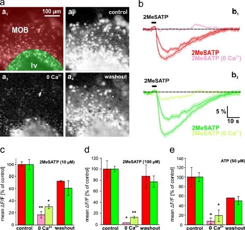 Fig. 5. Nucleotide-induced responses of OB and PVZ cells are differentially affected by omission of extracellular Ca2+. a Fura-2/AM stained acute slice preparation of the anterior telencephalon (a1; image acquired at rest). The area of the OB is shaded in red, and the area of the PVZ is shaded in green. Pixel correlation maps of the same slice (see âMaterials and methodsâ section for details) obtained upon application of 2MeSATP (100 μM; a2 standard bath solution; a3 application after 10 min in Ca2+-free bath solution; a4 application after returning to standard bath solution). b The corresponding 2MeSATP-induced mean [Ca2+]i transients (±SEM) of all clearly identifiable responsive cells of the OB [b1red traces: in normal bath solution (before and after application of Ca2+-free bath solution); light red traces: after 10 min in Ca2+-free bath solution; nâ=â82 cells] and of the PVZ [b2green traces: in normal bath solution (before and after application of Ca2+-free bath solution); light green traces: after 10 min in Ca2+-free bath solution; nâ=â59 cells]. c Mean peak responses (±SEM), expressed as percent of control response to 2MeSATP (10 μM), of 161 OB cells and 182 PVZ cells (two slices of the anterior telencephalon) in control conditions (red and green columns, respectively) and after 10 min in Ca2+-free bath solution (light red and light green column, respectively). d Same representation as in C with 2MeSATP [100 μM; 205 OB cells and 105 PVZ cells (two slices of the anterior telencephalon)]. e Same representation as in C with ATP [50 μM; 161 OB cells and 182 PVZ cells (two slices of the anterior telencephalon)]. (*pâ<â0.05 and **pâ<â0.01; unpaired t test). Abbreviations: MOB main olfactory bulb, lv lateral ventricle |