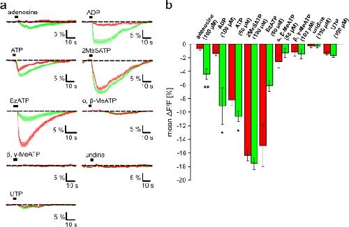 Fig. 6. Responsiveness of OB and PVZ cells to purinergic receptor agonists. a Mean [Ca2+]i transients (±SEM) of all clearly identifiable responsive cells of an OB (red traces) and a PVZ (green traces). Traces originate from more than one tissue slice. b The mean peak amplitude of agonist-induced responses (±SEM) of cells of the OB and the PVZ were compared (red columns OB cells, green columns PVZ cells). [adenosine (100 μM), data from 170 OB cells and 236 PVZ cells from 6 slices of the anterior telencephalon; ADP (100 μM), 245 OB cells and 154 PVZ cells from three slices; ATP (50 μM), 1566 OB cells and 1303 PVZ cells from 28 and 23 slices, respectively; 2MeSATP (100 μM), 378 OB cells and 285 PVZ cells from five slices; BzATP (50 μM), 213 OB cells and 93 PVZ cells from four and two slices, respectively; α,β-MeATP (50 μM), 310 OB cells and 198 PVZ cells from six and three slices, respectively; β,γ-MeATP (100 μM), 387 OB cells and 318 PVZ cells from seven and six slices, respectively; uridine (100 μM), 275 OB cells and 308 PVZ cells from six slices; UTP (100 μM), 335 OB cells and 324 PVZ cells from five slices]. (*p < 0.05 and **p < 0.01; unpaired t test). Abbreviations: ADP adenosine-5′-diphosphate, ATP adenosine-5′-triphosphate, UTP uridine-5′-triphosphate; α,β-MeATP α,β-methylene-ATP, β,γ-MeATP β,γ-methylene-ATP, 2MeSATP 2-methylthio-ATP, BzATP, 3′-O-(4-benzoyl)benzoyl ATP |