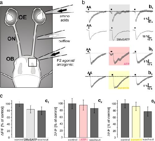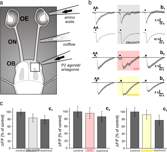 Fig. 8. Impact of the telencephalic purinergic system on the immediate processing of olfactory information in OB cells. a Schematic representation of a nose–brain preparation of larval X. laevis. The black rectangle indicates the area of the telencephalon monitored in the Ca2+ imaging experiments. b The mean response (±SEM) of all responsive cells of an OB (n = 45 cells) upon epithelial application of an odorant mixture (15 amino acids, each at 100 μM; see “Materials and methods” section) was not affected by continuous OB stimulation with 5 μM 2MeSATP (b1, upper row). Compare the trace in the gray-shaded area (amino acid-induced responses after 10 min of 2MeSATP perfusion) with the traces to its left (amino acid-induced responses prior to 2MeSATP perfusion) and right (amino acid-induced responses after 5 min washout of 2MeSATP). The lower row of b1 shows the amino acid-induced [Ca2+]i transient of a randomly chosen individual cell of the same slice. Also, the mean response (± SEM) of all amino acid-responsive cells of an OB (n = 23 cells) was not affected by continuous OB stimulation with 100 μM ATP (b2). Compare the trace in the light red-shaded area (amino acid-induced responses after 10 min of ATP perfusion) with the traces to its left (amino acid-induced responses prior to ATP perfusion) and right (amino acid-induced responses after 5 min washout of ATP). Prolonged application of 200 μM suramin did also not disrupt the mean response (±SEM) of all amino acid-responsive cells of an OB (n = 35 cells; b3). Compare the trace in the yellow-shaded area (amino acid-induced responses after 5 min of suramin perfusion) with the traces to its left (amino acid-induced responses prior to suramin perfusion) and right (amino acid-induced responses after 5 min washout of suramin). c The mean peak responses (±SEM), expressed as percent of control response to an epithelial application of 100 μM amino acid mixture (200 OB cells from four nose–brain preparations) in control conditions (dark gray columns) and after 5 to 10 min in bath solution with 5–20 μM 2MeSATP (light gray column) are shown in c1. The mean peak responses ± SEM, expressed as percent of control response to an epithelial application of 100 μM amino acid mixture [78 OB cells/5 slices for ATP (100 μM) and 81 OB cells/4 slices for suramin 200 μM)] in control conditions (dark gray columns) and after 5 to 10 min in bath solution with ATP or suramin (light red and yellow column) are respectively given in c2 and c3. Abbreviations: OE olfactory epithelium, ON olfactory nerve, OB olfactory bulb, AA amino acid mixture |