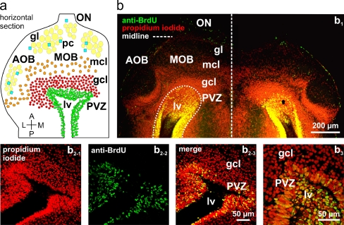 Fig. 2. Cells in the periventricular zone of the lateral ventricle actively proliferate. a Schematic representation of the anterior telencephalon of larval X. laevis. b Overview over a horizontal section of the anterior telencephalon (b1) in which all cell nuclei were stained with propidium iodide (red fluorescence) and proliferating cells were visualized with a BrdU incorporation assay (green fluorescence). Proliferating cells appear yellow. Higher magnification of the periventricular region of different animals (b2-1–b2-3 and b3). Abbreviations: ON olfactory nerve, MOB main olfactory bulb, AOB accessory olfactory bulb, PVZ periventricular zone, gl glomerular layer/glomeruli, mcl mitral cell layer, gcl granule cell layer, lv lateral ventricle, pc periglomerular cells |