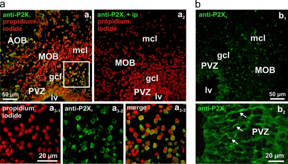 Fig. 7. Distribution of P2X7- and P2X4-like immunoreactivity in the anterior telencephalon. a Immunoreactivity to a P2X7 antibody (green fluorescence) and cell nuclei staining with propidium iodide (red fluorescence) of a slice of the anterior telencephalon is shown in a1. Another slice treated with the anti-P2X7 antibody after preadsorption with the immunizing protein and counterstained with propidium iodide is shown in a2. Higher magnification of the region indicated by the white rectangle in a1 is shown in a3-1âa3-3. Note the clear somatic staining pattern of OB cells. b Immunoreactivity to a P2X4 antibody (b1) of another slice of the anterior telencephalon. Higher magnification of the P2X4-like immunoreactivity of the PVZ (b2). Note the stained tubular structures starting from the lateral ventricle and extending towards the OB (see arrows). Abbreviations: MOB main olfactory bulb, AOB accessory olfactory bulb, PVZ periventricular zone, lv lateral ventricle, mcl mitral cell layer, gcl granule cell layer |