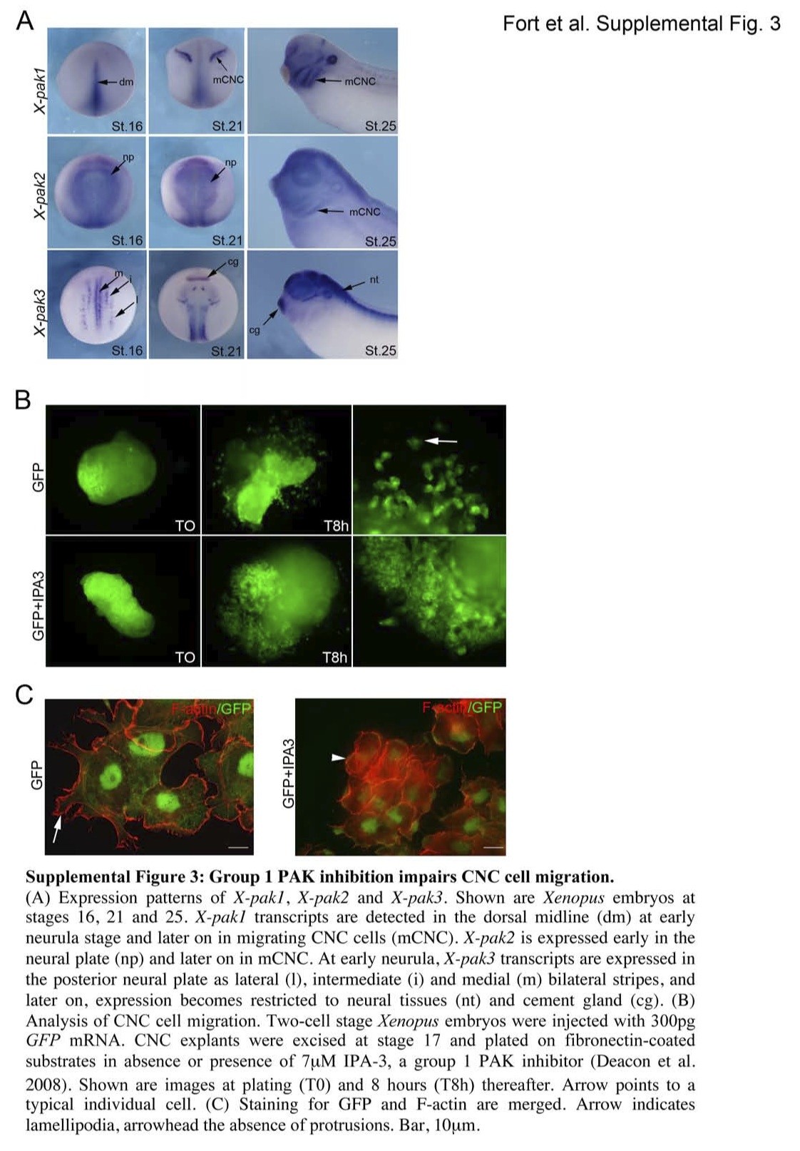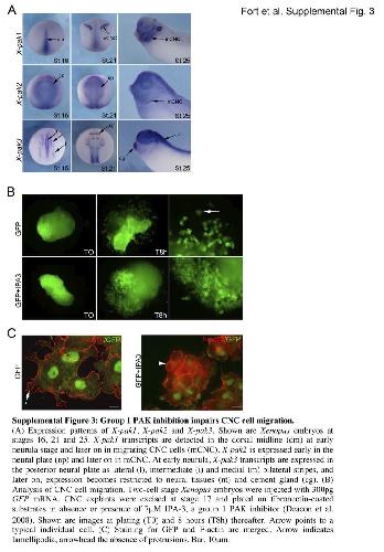 Fig. 7. RhoU controls CNC cell migration through PAK- and Rac-dependent pathways. (C) Analysis of CNC cell protrusions. CNC explants from embryos injected as in (A) were excised at stage 17 and plated on fibronectin-coated substrates. Staining for GFP (green) and F-actin (red) were merged. Arrows indicate lamellipodia and arrowheads filopodia. KR-PAK1 expressing cell shown is representative of 85% observed cells (n = 160). DE-PAK1 expressing cell shown is representative of 69% observed cells (n = 140). Bar, 10 μM. (D) Cells from RhoU-MO or RhoU-MO+ Wt-Rac1 mRNA-injected embryos. GFP (green) and F-actin (red) staining were merged. Arrows indicate lamellipodia. Co-injected cells shown are representative of 56% observed cells (n = 140). Bar, 10 μM. |