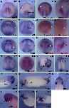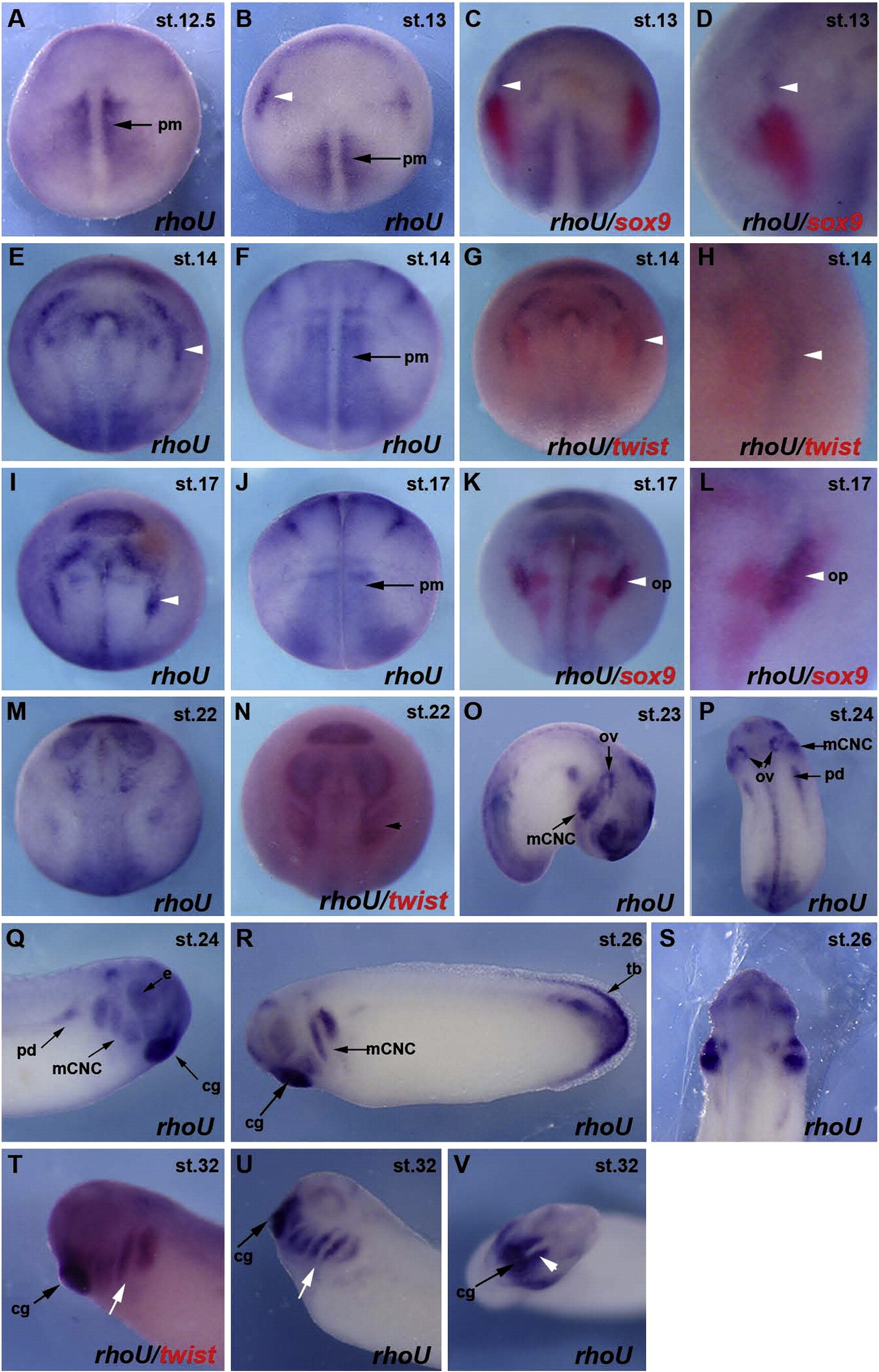 Fig. 1. Localization of rhoU mRNA by ISH. ISH analysis of rhoU expression at different stages (st.) of development. (A, B, E, F), dorsal views. rhoU mRNA is detected at early neurula stages in paraxial mesoderm (pm) and in two domains lateral to the neural plate (white arrowheads). (C, D, G, H), dorsal views. Double rhoU/sox9 and rhoU/twist ISH analyses show that the two rhoU-positive lateral domains (white arrowheads) are excluded from the presumptive NC territories that are sox9 and twist positive. (I, J, K, L), dorsal views. Before migration, rhoU is expressed in paraxial mesoderm (pm) and otic placodes (op, white arrowheads), as revealed by double rhoU/sox9 ISH analyses (K, L). (M, N), anterior views. RhoU is expressed in migrating CNC cells, as demonstrated by rhoU/twist ISH analyses (black arrowhead in N). (O), lateral view (P), dorsal view, (Q), lateral view. From stages 23 to 24, rhoU transcripts are mainly localized in migrating CNC cells (mCNC), otic vesicles (ov), pronephric ducts (pd), eyes (e) and cement gland (cg). (R), lateral view, (S), dorsal view. RhoU expression is maintained later on in migrating CNC cells (mCNC) and cement gland (cg). At this stage, rhoU expression is abundant in the tail bud (tb). (T, U), lateral views. (V), anterior view. At stage 32, rhoU expression is found in the pharyngeal arches (white arrow), in the cement gland (cg) and in the anterior-most hatching gland (white arrowhead in panel V). |